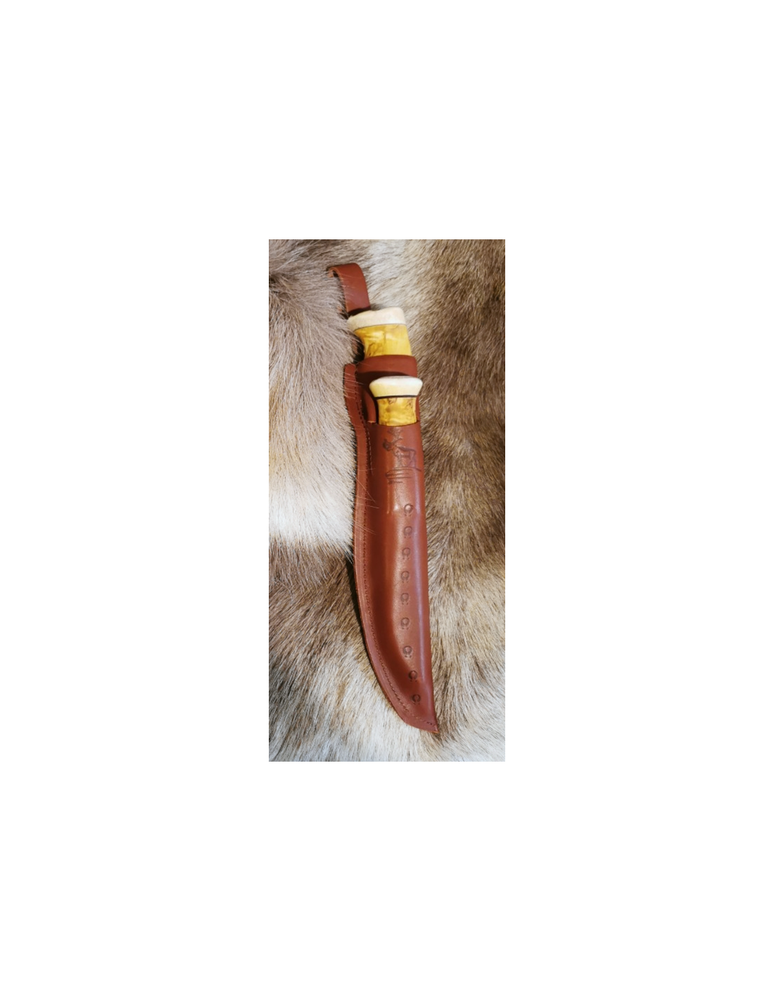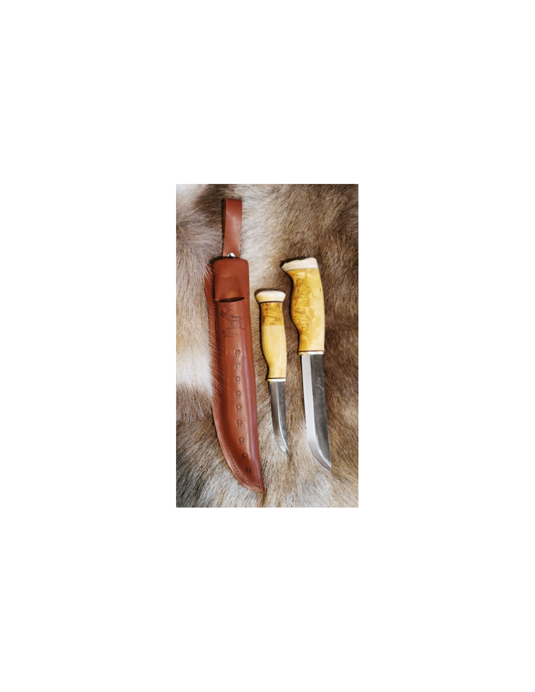 Knivarnas handtag är gjorda av älghorn, trä och masurbjörk. Bladen är av kolstål.
