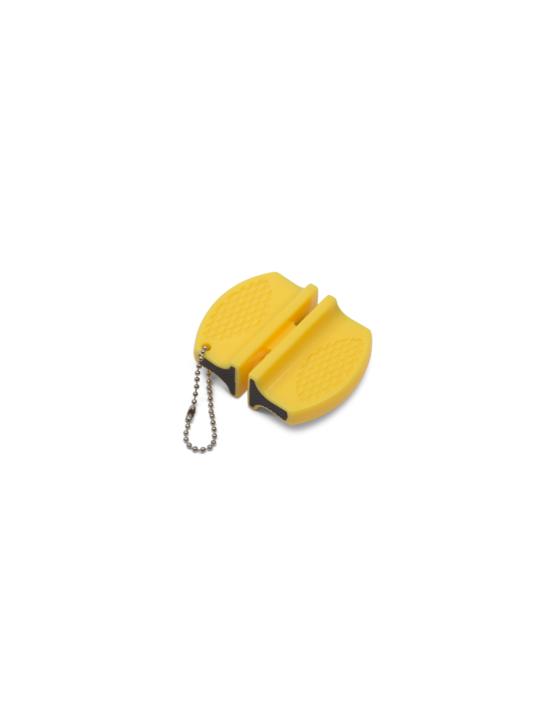 Enkel och lättanvänd knivslip med hölje i plastmaterial med en smidig kulkedja så att den kan fästas där du vill. Slipen har en sida i karbidmaterial (metall) och en sida med keramiska stavar (vitt).