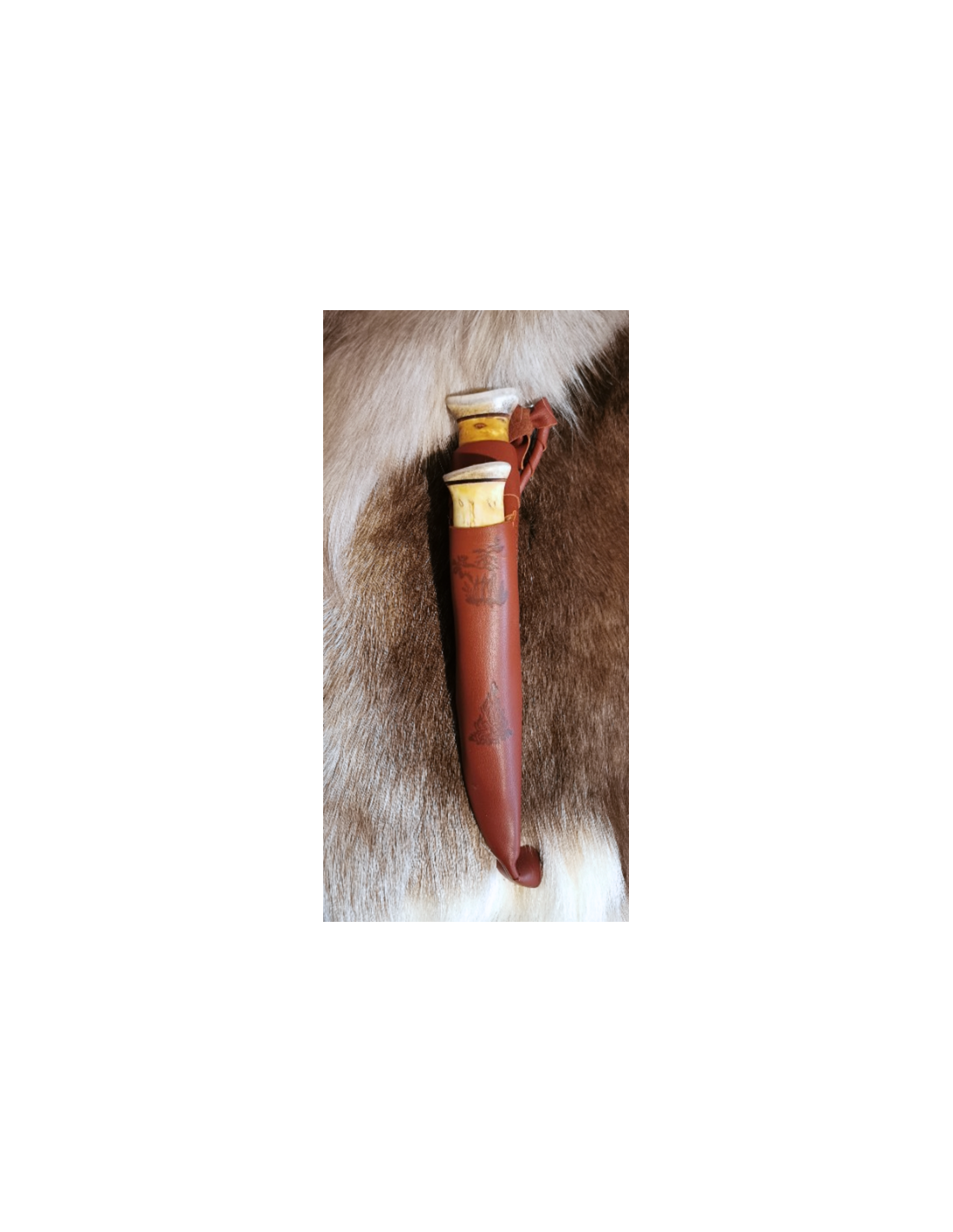 Knivarnas handtag är gjorda av älghorn, trä och masurbjörk. Bladen är av kolstål.