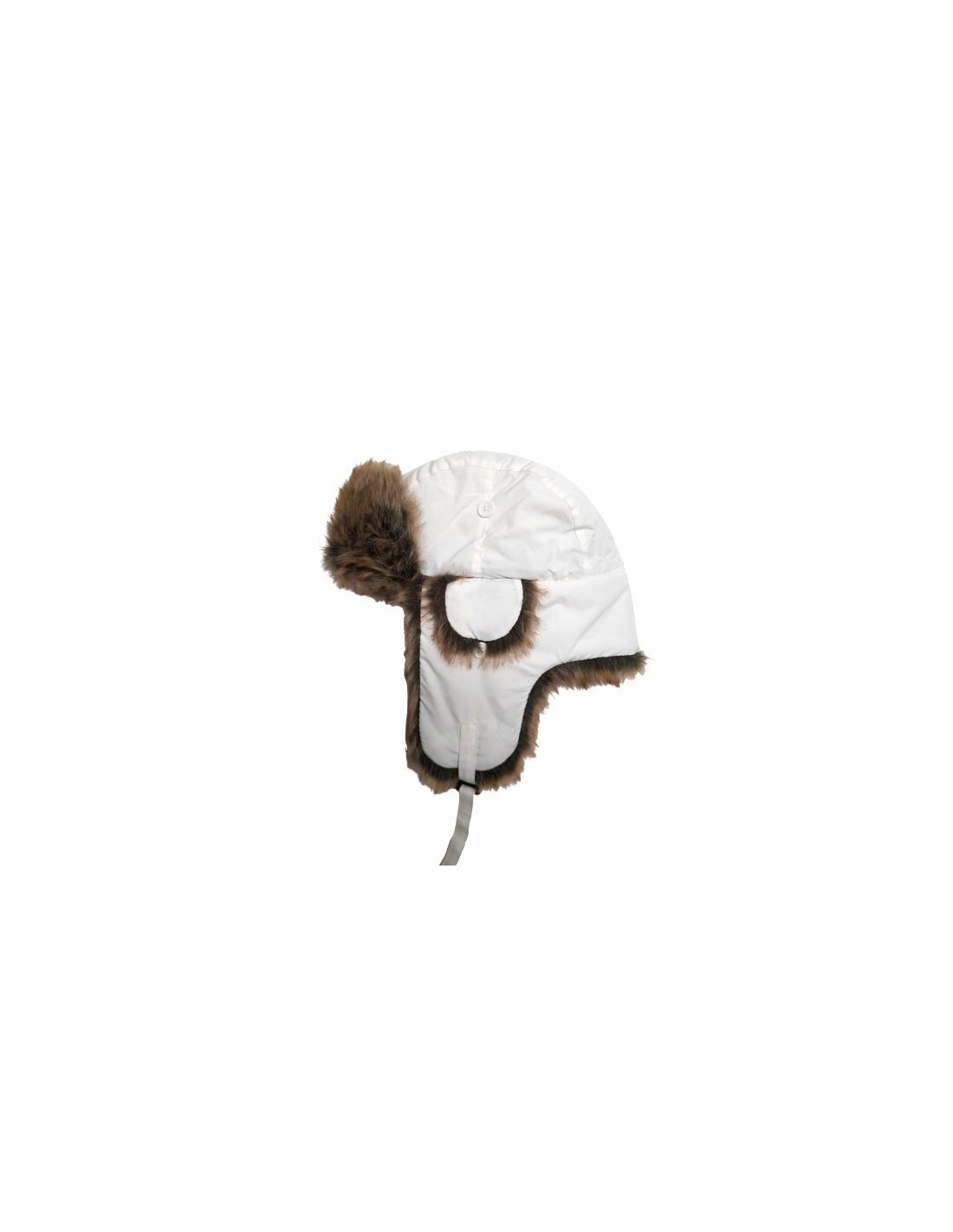 Vit mössa klädd med brun fuskpäls. Kan fästas under hakan med ett spänne.